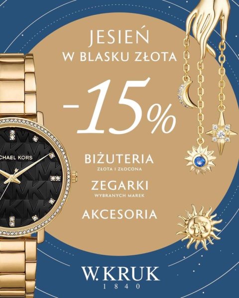 -15%  na złotą i złoconą biżuterię, akcesoria i wybrane marki zegarków. Zapraszamy do salonu W.KRUK Szczytno, Galeria Jurand, ul. Odrodzenia 11.