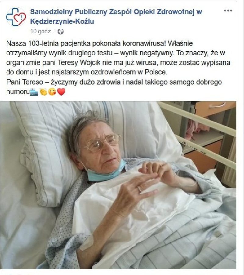 W niedzielę do szpitala dotarły powtórzone wyniki testu na obecność koronawirusa. Podobnie jak poprzednie, były negatywne. Prawdopodobnie w poniedziałek pacjentka, już jako najstarsza w Polsce i jedna z najstarszych na świecie ozdrowieńców, opuści szpitalne mury.