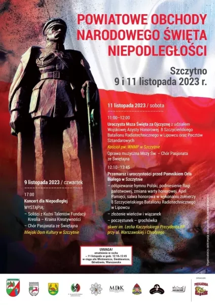 Natomiast w sobotę, 11 listopada, odbędzie się Uroczysta Masz Święta za Ojczyznę w kościele pw. Wniebowzięcia Najświętszej Maryi Panny w Szczytnie. Po Mszy Świętej nastąpi przemarsz ulicami miasta na dalszą część uroczystości pod pomnikiem Orła Białego w Szczytnie. Poniżej szczegółowy program obchodów.
