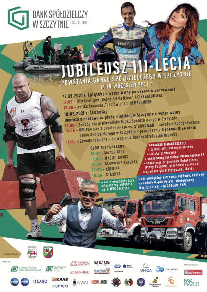 W piątek, 17 września odbyła się uroczysta gala z okazji 111-lecia Banku Spółdzielczego w Szczytnie. A już jutro, w sobotę, 18 września na plaży miejskiej, od godz. 12:00 będą trwały rocznicowe obchody 111 rocznicy powstania Banku. W programie m.in. rywalizacja sportowa, zawody StrongMan.