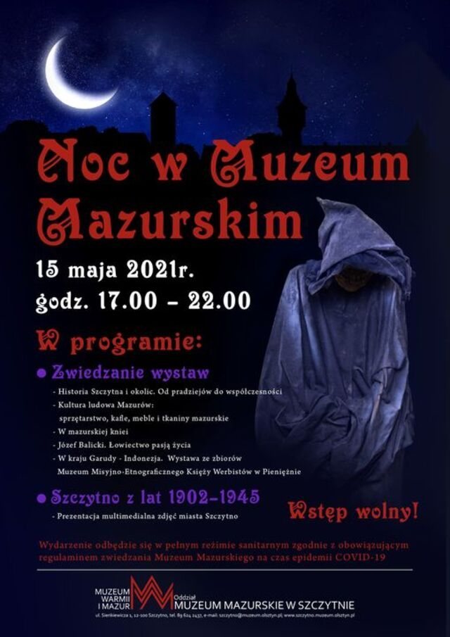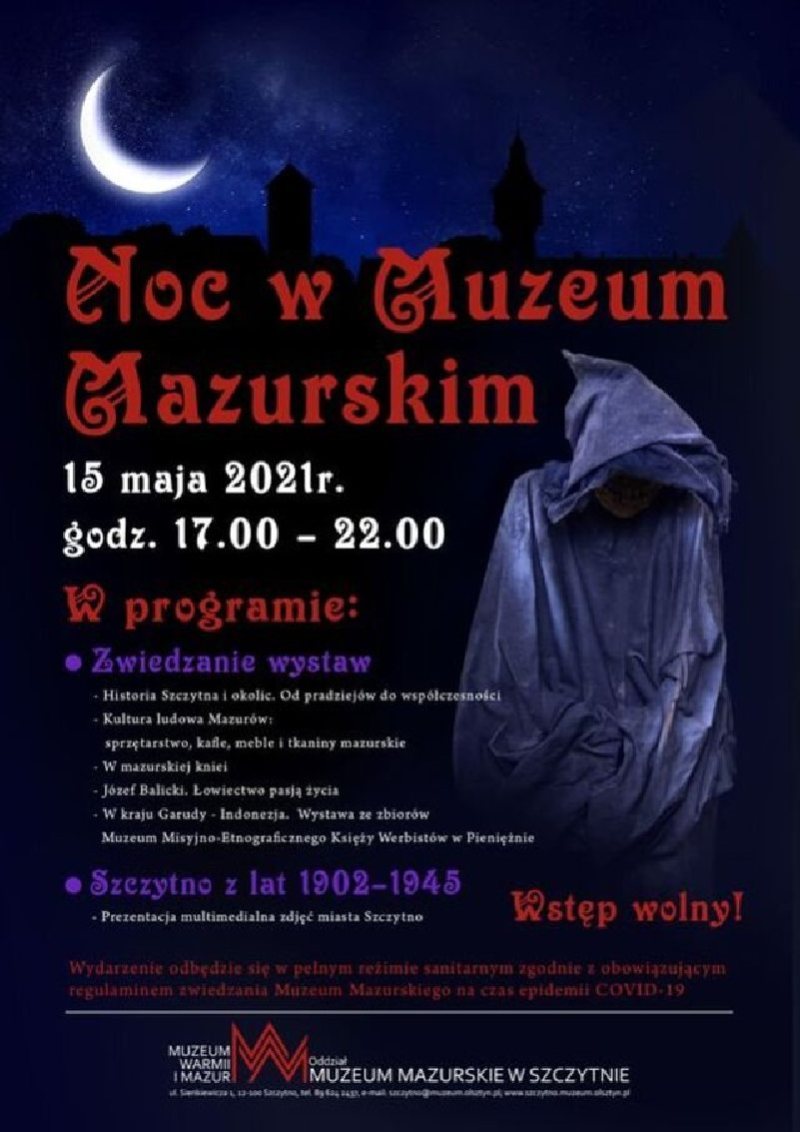 Muzeum Mazurskie w Szczytnie Oddział Muzeum Warmii i Mazur serdecznie zaprasza 15 maja br. na nocne zwiedzanie wystaw. Szczegóły na plakacie.