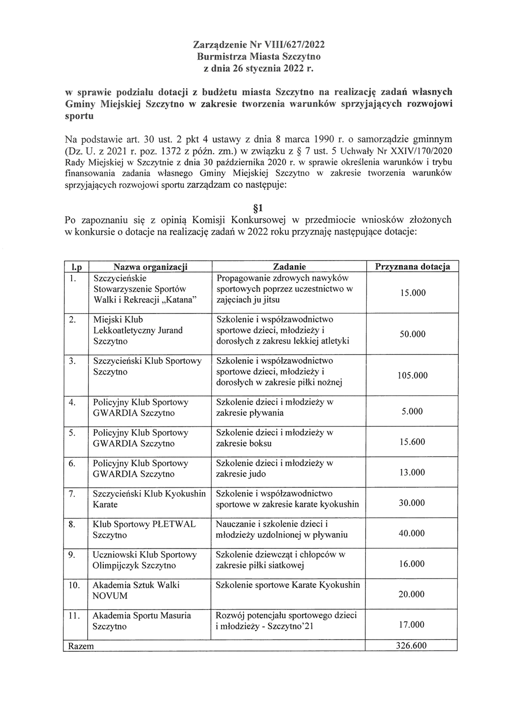Najwięcej otrzymał piłkarki zespół SKS Szczytno, który na realizację zadań otrzymało 105 tys złotych. Najmniejszą dotację przyznano sekcji pływania Gwardii Szczytno, która otrzymała z budżetu miasta 5 tys złotych. Pełny dokument dostępny poniżej.