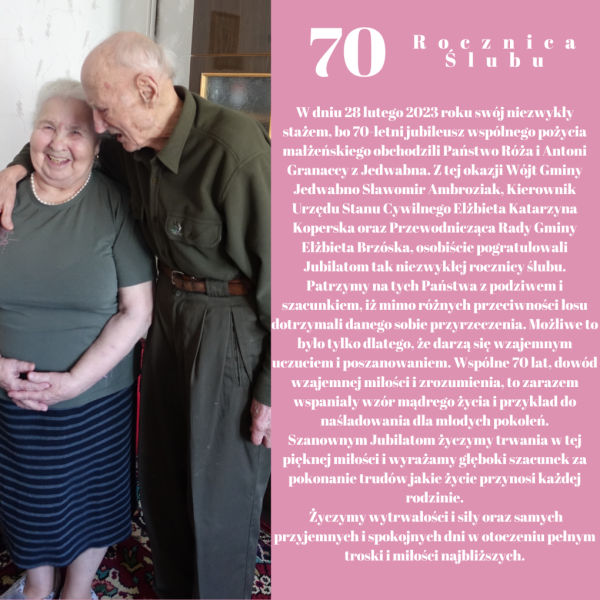 Państwo Róża i Antonii Granaccy z Jedwabna 28 lutego świętowali 70. rocznicę swojego ślubu, która jest nazywana "kamiennymi godami". Z tej okazji parę odwiedzili między innymi urzędnicy gmin Jedwabno, na czele z wójtem Sławomirem Ambroziakiem, przewodniczącą rady gminy Elżbietą Brzóską oraz kierownikiem USC w Jedwabnie Elżbietą Koperską.