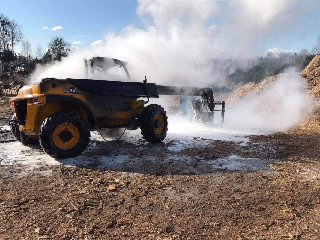 Pożar powstał około godziny 13. Maszyna zaczęła płonąć, gdy była użytkowana. Operator zdołał ją opuścić, nic mu się nie stało. Najpierw samodzielnie zaczął gasić ogień, ale nie dał rady. Wezwano strażaków. Podali oni dwa prądy piany ciężki i ugasili płomienie.