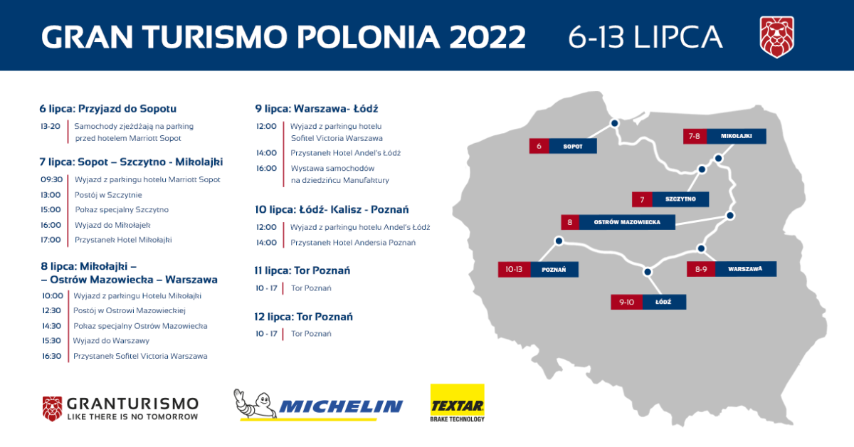 Już za nieco ponad tydzień, największa i najstarsza w Polsce impreza dla właścicieli supersamochodów, Gran Turismo Polonia, rozpoczyna swoją spektakularną trasę po kraju. Całe wydarzenie potrwa tydzień (6 - 13 lipca). Z punktu startowego - Trójmiasta - ponad 100 supersamochodów wyruszy w czwratek (7 lipca) do miejsca pierwszego przystanku - Szczytna. Planowany postój godzina 13:00. Auta pojawia się na Placu Juranda.