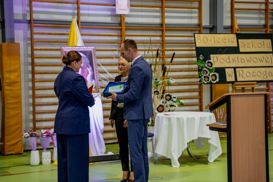 Nie zabrakło gestów życzliwości. Rada Rodziców podarowała uczniom zestaw gier edukacyjnych i stół do piłkarzyków, a radni gminni oraz szkoły z Dąbrowych i Klonu przekazali gry planszowe i książki. Zakład Gospodarki Komunalnej ofiarował voucher na usługę, a Wójt Gminy Rozogi uhonorował placówkę pamiątkową statuetką.