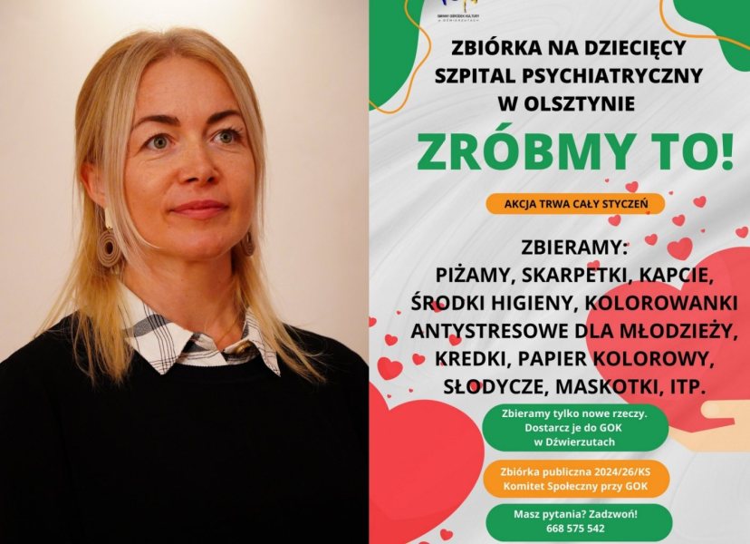 - To publiczna zbiórka potrzebnych rzeczy, typu: piżamy, skarpetki, kapcie, środki higieny, kolorowanki antystresowe, kredki, kolorowy papier, słodycze, maskotki... - wylicza Ewa Dolińska-Baczewska, dyrektor GOK Dźwierzuty. - Warunek, wszystkie rzeczy muszą być nowe.