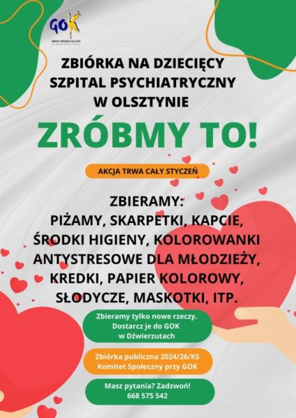 Mieszkańcy gminy Dźwierzuty pomogą dzieciom i młodzieży z Dziecięcego Szpitala Psychiatrycznego w Olsztynie. Za sprawą Gminnego Ośrodka Kultury w Dźwierzutach ruszyła akcja „Zróbmy To!”.