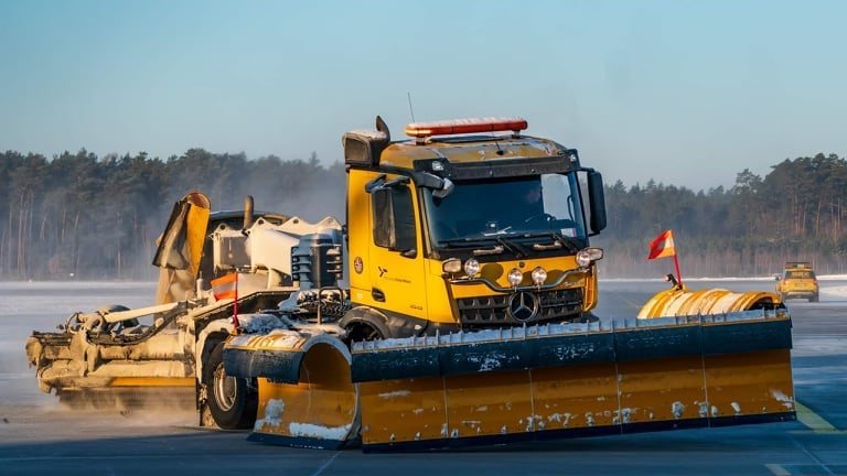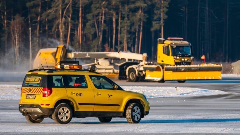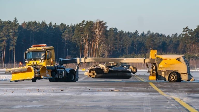 Z niskimi temperaturami i opadami śniegu mierzą się specjalistyczne pojazdy przystosowane do pracy na lotnisku, które wykorzystywane są do przygotowania powierzchni pasa startowego, dróg kołowania oraz płyt postojowych do sprawnej obsługi samolotów.