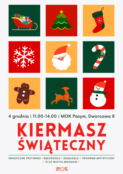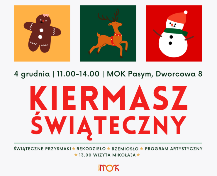 Miejski Ośrodek Kultury w Pasymiu zaprasza w niedzielę, 4 grudnia na niesamowity kiermasz świąteczny. Początek atrakcji godz. 11. Pasym będzie gościł wielu wystawców z przeróżnym asortymentem. Wśród stoisk z rękodziełem i rzemiosłem znajdziemy rzeczy piękne i niebanalne – podarunki i prezenty, stroiki i świąteczne dekoracje. Sezonowe przysmaki czekać będą na nas pośród stoisk z domowymi ciastami, pierogami czy wyrobami mięsnymi... – zachęcają organizatorzy.
