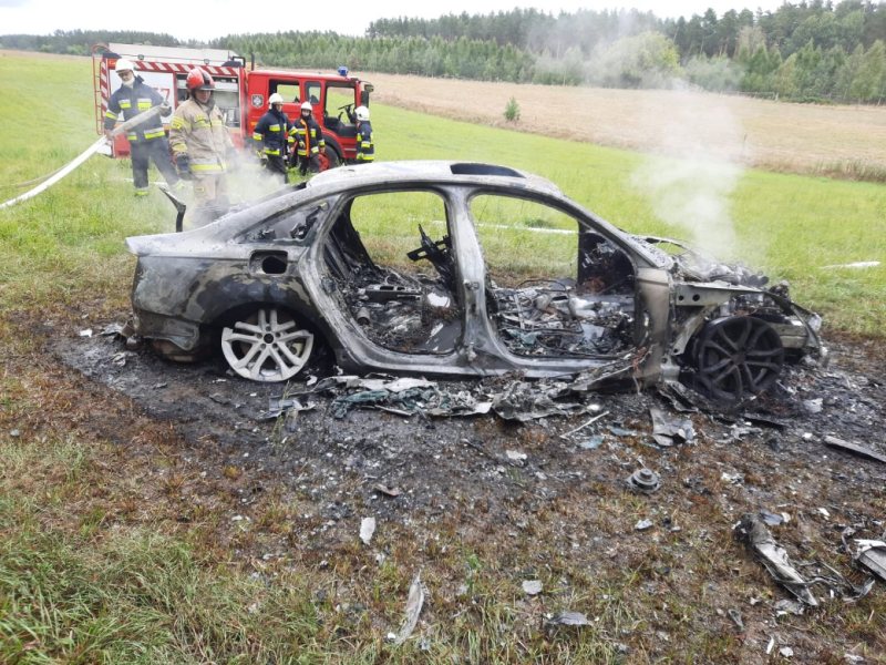 - Gdy nasze zastępy dojechały na miejsce wezwania, samochód był objęty w całości ogniem – mówi kapitan Łukasz Wróblewski z KP PSP w Szczytnie.