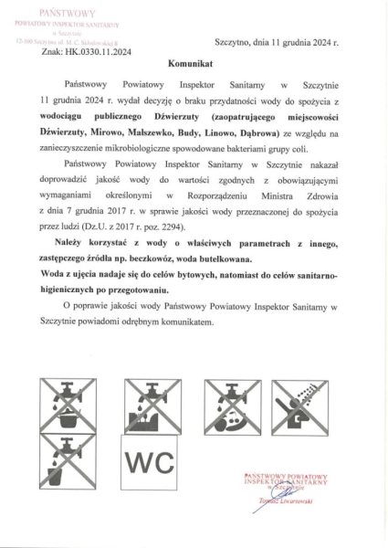 Kolejny raz w gminie Dźwierzuty jest kłopot z jakością wody. Państwowy Powiatowy Inspektor Sanitarny w Szczytnie ogłosił w środę, 11 grudnia decyzję o braku przydatności do spożycia wody z wodociągu publicznego Dźwierzuty. Decyzja dotyczy miejscowości Dźwierzuty, Mirowo, Małszewko, Budy, Linowo oraz Dąbrowa. Powodem są zanieczyszczenia mikrobiologiczne spowodowane obecnością bakterii grupy coli.