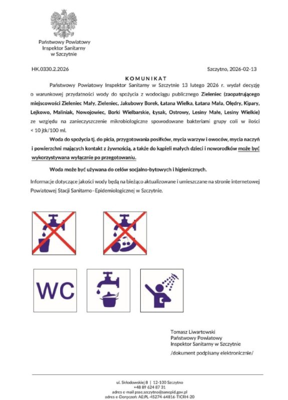 Decyzję podpisał Tomasz Liwartowski, Państwowy Powiatowy Inspektor Sanitarny w Szczytnie. Dokument ma datę 13 lutego 2026 r. Sanepid zapowiada bieżące aktualizacje informacji na stronie internetowej Powiatowej Stacji Sanitarno-Epidemiologicznej w Szczytnie.