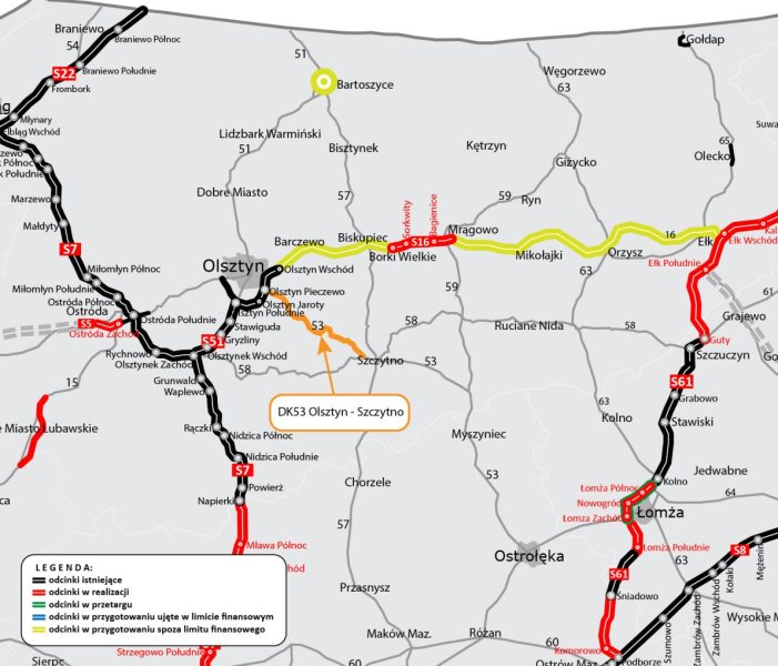 Będzie przebudowa drogi krajowej Szczytno – Olsztyn. Niestety nie powstanie tam droga ekspresowa. Ale nie wykluczone, że pojawią się odcinki 2 plus 1, czyli dwa pasy ruchu w jedną stroną i jeden w drugą, aby móc rozładować ruch. Droga na pewno będzie wyprostowana i nieco poszerzona. Prace mają objąć odcinek 34 kilometrów od obwodnicy Olsztyna, do planowej obwodnicy Szczytna.