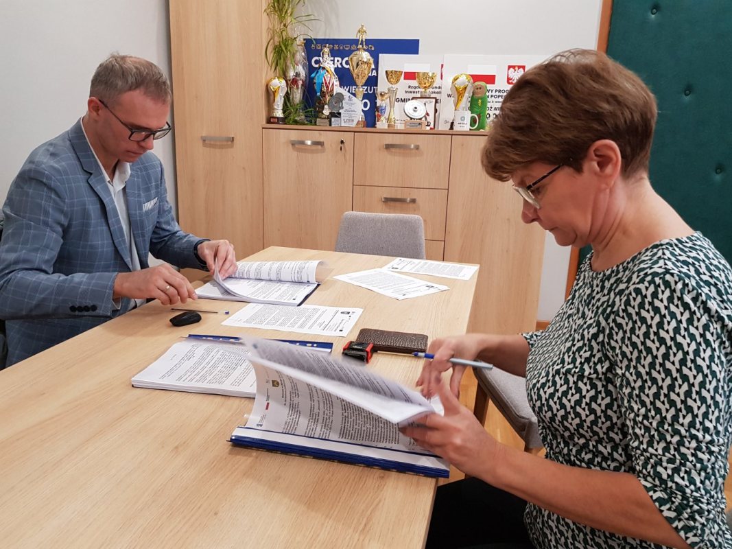 Dopiero czwarty przetarg wyłonił wykonawcę zadania pn. „Termomodernizacja budynku Gminnego Ośrodka Kultury w Dźwierzutach". Wójt Gminy Dźwierzuty Pani Marianna Bogusława Szydlik podpisała w poniedziałek, 15 listopada, umowę z Panem Michałem Zarembskim przedstawicielem firmy MEZARIST Michał Zarembski. Prace budowlane na obiekcie mają zakończyć się do 15 marca 2022 roku. Zgodnie z umową kwota wynagrodzenia Wykonawcy wynosi 763 735,61 zł brutto.