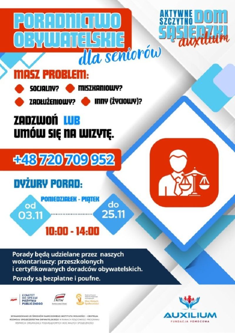 Fundacja Auxilium zaprasza mieszkańców gminy Szczytno do korzystania z bezpłatnego poradnictwa obywatelskiego w Aktywnym Domu Sąsiedzkim. Oferta skierowana jest przede wszystkim do seniorów, którzy potrzebują wsparcia w sprawach urzędowych i życiowych.