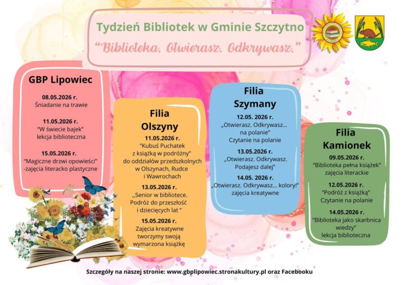 Tydzień Bibliotek organizowany przez Gminną Bibliotekę Publiczną w Lipowcu oraz jej filie w Szymanach, Olszynach i Kamionku to cykl spotkań, zajęć i działań skierowanych do różnych grup mieszkańców – od najmłodszych po seniorów.