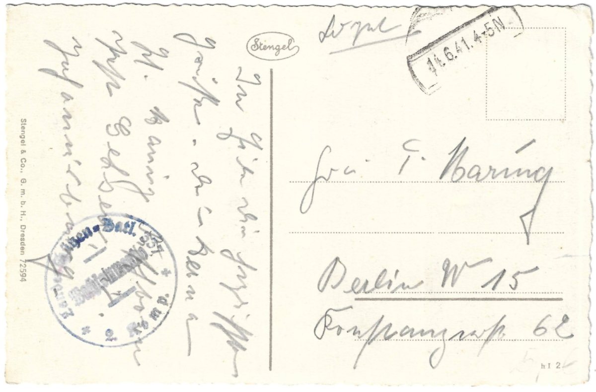 Na odrocie pocztówki znajduje się korespondecja wysłana pocztą polową ze stpemplem 337. Batalionu Strzelców Krajowych (Landesschützen-Bataillon 337). Batalion ten został sformowany 11 czerwca 1940 roku w obozie Tiborlager (obecnie Cibórz koło Świebodzina), w III Okręgu Wojskowym. Po sformowaniu został skierowany do Królewieca. Początkowo stacjonował na poligonie Stablack (obecnie Kamińsk/Stablawk koło Górowa Iławeckiego). Następnie przeniesionogo do miejscowości Heydekrug (obecnie Szyłokarczma na Litwie). 11 sierpnia 1942 roku jednostka została przeniesiona do Gliwic. 14 sierpnia 1942 roku 3. kompania batalionu została odesłana do Laponii jako 1. kompania 309. Batalionu Strzelców Krajowych. W 1943 roku batalion stacjonował w Chorzowie gdzie podlegał Dowódcy ds. Jeńców Wojennych VIII (Kommandeur der Kriegsgefangenen VIII).