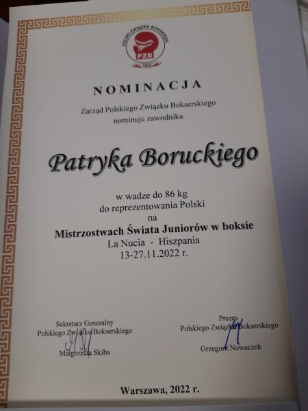 Wielki sukces wychowanka bokserskiej sekcji Gwardii Szczytno. Patryk Borucki odebrał z rąk prezesa Polskiego Związku Bokserskiego nominację na udział w Mistrzostwach Świata Juniorów w boksie w La Nucia.
