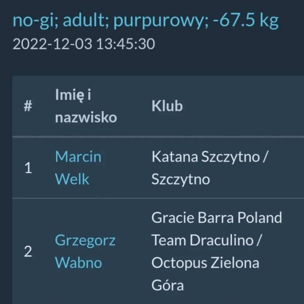 Kolejnym sukcesem pochwalić się może Marcin Welk, który tego samego dnia wystartował w Luboniu w turnieju Winter Open. W kimonach wywalczył srebro, natomiast bez kimon z pasem purpurowym - złoto.