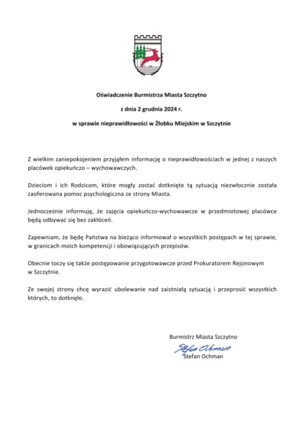 Burmistrz Szczytna Stefan Ochman wydał oświadczenie w sprawie szokujących wydarzeń w jednym z miejskich żłobków. Dwie opiekunki usłyszały zarzuty naruszenia nietykalności cielesnej dzieci, co wstrząsnęło lokalną społecznością. Burmistrz zapewnił, że działania naprawcze są priorytetem dla władz miasta.