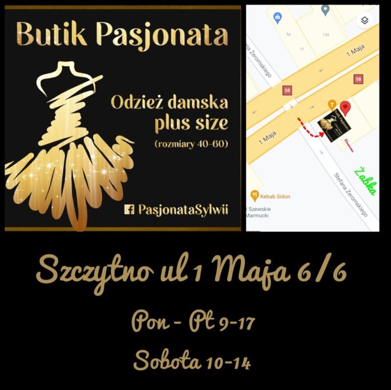 Promocja. Masz problem z kupieniem ubrań, bo większość asortymentu kończy się na rozmiarze 42? Zajrzyj do Butiku Pasjonata Sylwii. Oferujemy odzież polskich, włoskich i tureckich producentów w rozmiarach od 40 do 60. Serdecznie ZAPRASZAMY. Szczytno, ul. 1 Maja 6/6.