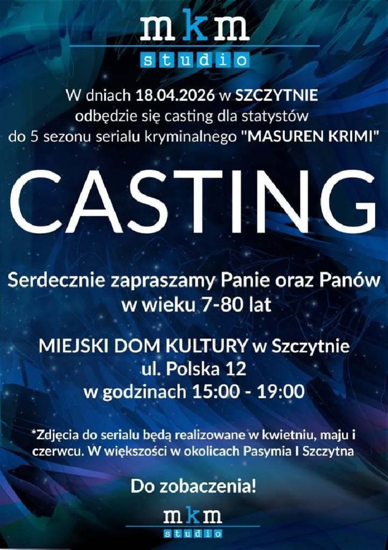 Casting odbędzie się w Miejskim Domu Kultury przy ul. Polskiej 12, w godzinach od 15:00 do 19:00. Wziąć udział mogą osoby w wieku od 7 do 80 lat. To propozycja zarówno dla tych, którzy marzą o pierwszym kontakcie z planem filmowym, jak i dla tych, którzy po prostu chcą spróbować czegoś nowego.