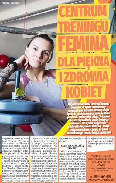 - Nie ukrywam, że w tym się specjalizujemy – mówi pani Magdalena. - Zajęcia odbywają się zarówno indywidualnie, jak i grupowo. Podstawa to bezpieczeństwo. Jako fizjoterapeutka specjalizuję się w uroginekologii. Prowadzimy terapie rozejścia mięśnia prostego brzucha, blizn po cięciu czy nietrzymania moczu. Zapraszam do kontaktu. U nas każda pani będzie czuła się wyjątkowo, bo Centrum Treningu Femina jest wyłącznie dla pań.
