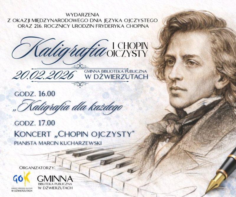 W piątek, 20 lutego, Gminna Biblioteka Publiczna w Dźwierzutach zaprasza mieszkańców na wydarzenie poświęcone językowi i muzyce. Okazją jest Międzynarodowy Dzień Języka Ojczystego oraz 216. rocznica urodzin Fryderyka Chopina. W programie warsztaty kaligrafii, koncert fortepianowy i recytacja.