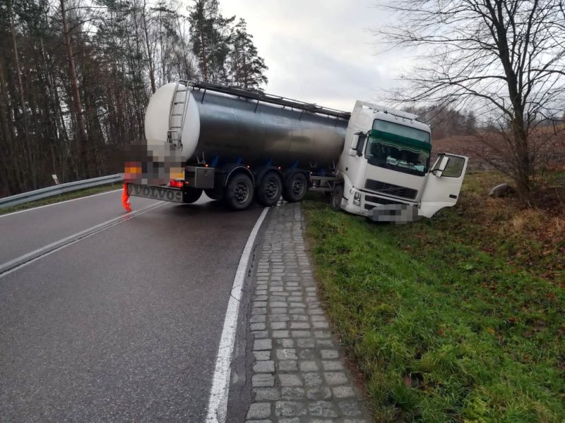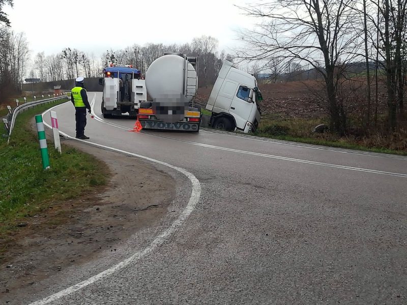 Ciężarówka to volvo z cysterną przystosowaną do przewozu mleka. Na szczęście beczka była pusta. Autem kierował 44-letni mieszkaniec Mazowsza. Nie ucierpiał w tym zdarzeniu.