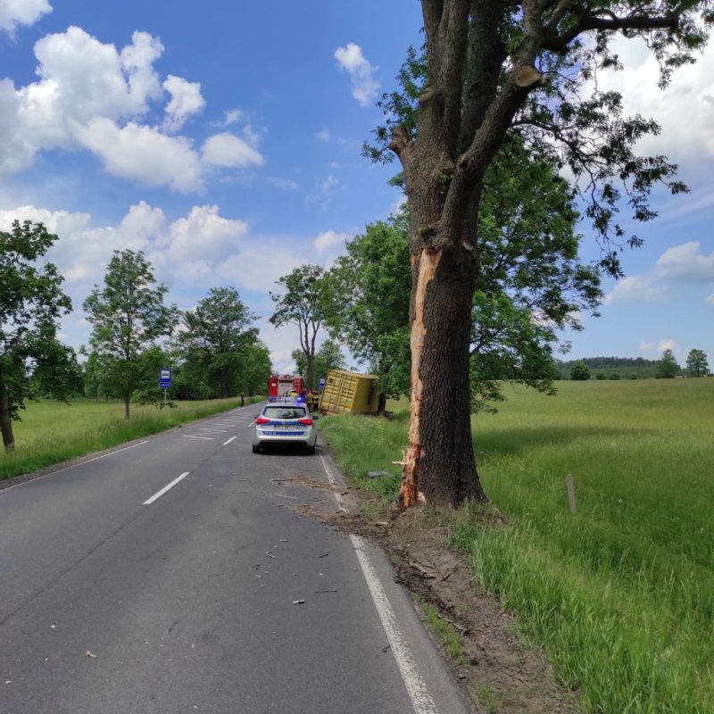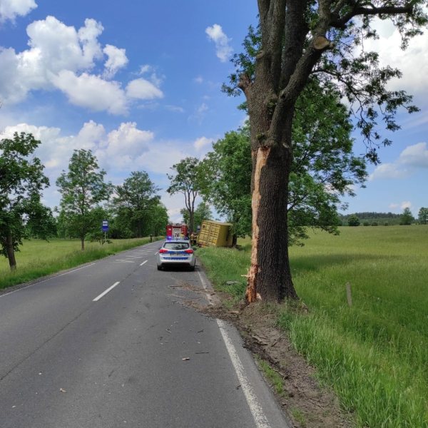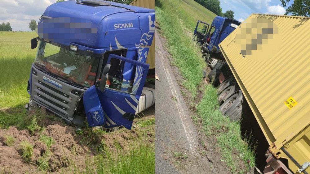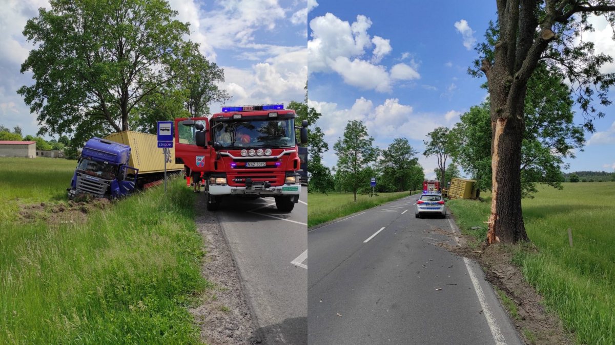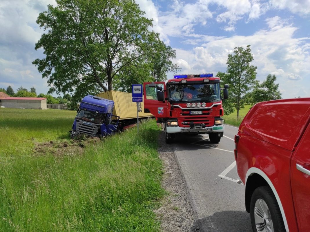Do wypadku doszło około godziny 13. Ciężarówka wypadła z drogi i zatrzymała się w rowie. Ze wstępnych ustaleń funkcjonariuszy pracujących na miejscu kraksy wynika, że powodem wypadku było pęknięcie opony w ciężarówce.