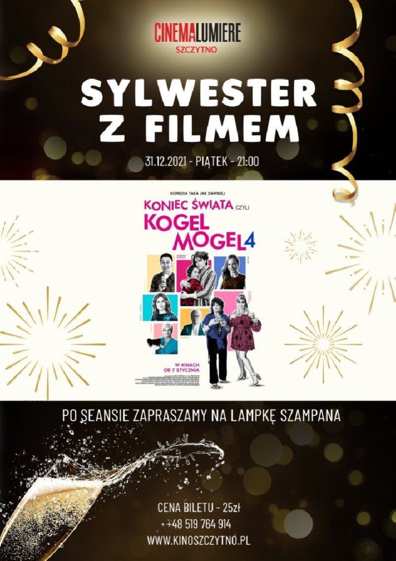 Brak planów na sylwestra? Cinema Lumiere Szczytno zaprasza na filmowego sylwestra. 31 grudnia 2021 r. o godz. 21:00 zostanie wyświetlony przedpremierowo film "Koniec świata, czyli kogel mogel 4".