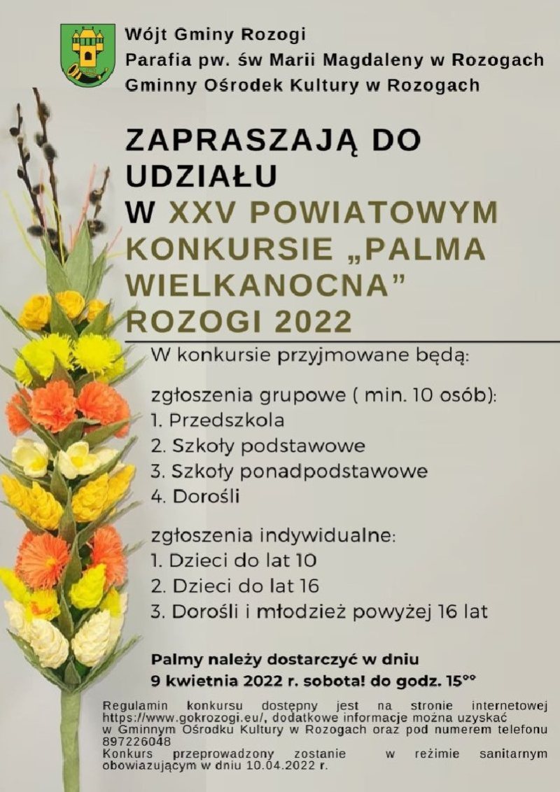 Konkurs Palmy Wielkanocnej w Rozogach organizowany jest już od ćwierć wieku. Ruszyła właśnie rekrutacja do konkursu. Szczegóły na plakacie.
