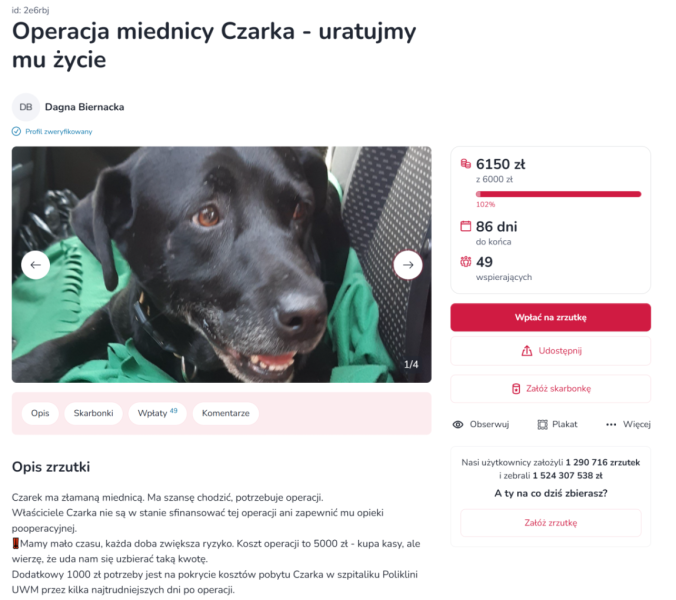 Potrzebujemy domu tymczasowego lub docelowego na już - mówi Dagna Biernacka, która osobiście troszczy się teraz o psa. - W środę Czarek opuszcza szpital, a przed nim 10 tygodni rehabilitacji po operacji. Jeśli ktoś może pomóc proszę, by to dla niego zrobił. Czarek uwielbia ludzi. Widać, że jest wdzięczny za każdy kontakt. Wszystkie bolesne zabiegi przeszedł bez choćby jęknięcia. Prawie cały czas merda ogonem. To bardzo łagodny i ciepły pies. Warto dać mu dobre życie.