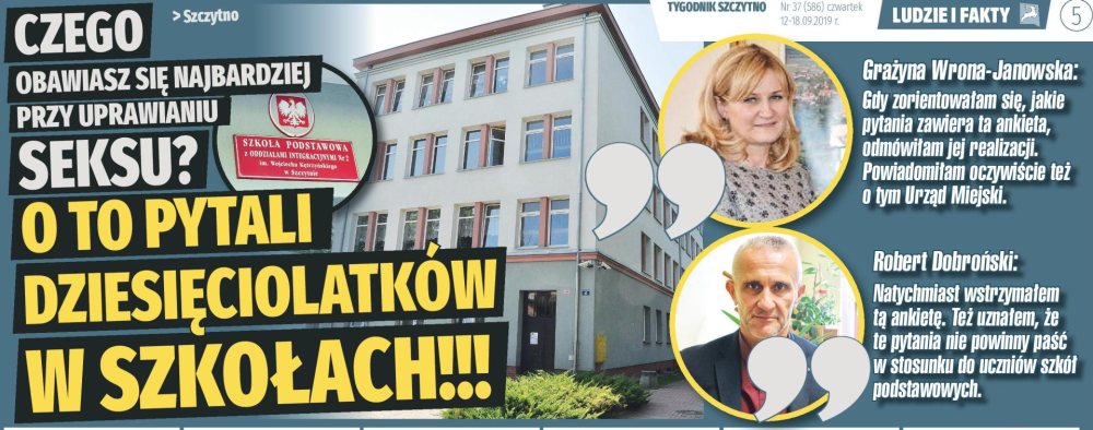 A JA SIĘ BĘDĘ UPIERAŁ (żeby już się tak nie powtarzać dosłownie): To dlaczego rodzą dzieci - dzieci w wieku lat 12, 13, czy 14 (w Polsce 2009, 2016, 2019, a o ilu nie wiemy)? Może jednak nie dawać się oszukiwać? Jeżeli w tym wieku następuje monitoruje się stalking, narkotyki, alkohol - to może i w kwestii seksu zasadne jest takie pytanie? Ale czy do tego jest przygotowana obecna szkoła? Lekcja religii to za mało. Ankieta może bulwersować, ale przynajmniej rodziców i nauczycieli zmusi do myślenia i rozmów z młodszą i starszą młodzieżą na tzw. trudne tematy. A co do p. Dobrońskiego... sam wpakował się na minę, ale dzięki niemu zaczęło się mówić o tym, co dzieje się w szkołach!