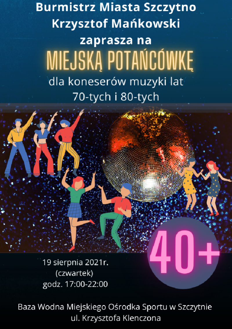 Na czwartek, 19 sierpnia zapanowano Miejską Potańcówkę dla koneserów muzyki lat 70 i 80-tych. Impreza odbędzie się w bazie Miejskiego Ośrodka Sportu przy ulicy Klenczona. Początek godz. 17. Szczegóły na plakacie.
