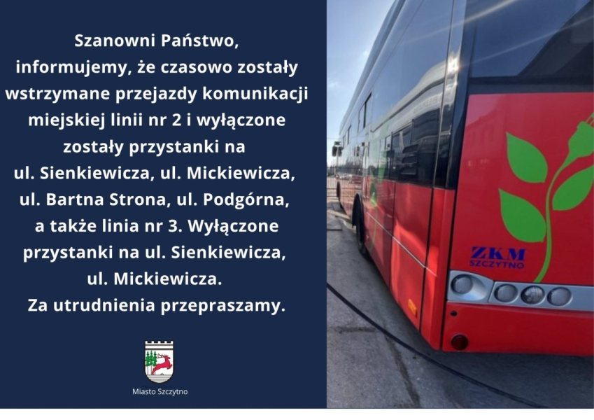 Chwilę po zdarzeniu ratusz wydał komunikat: tymczasowo wstrzymane zostają przejazdy komunikacji miejskiej linii nr 2 i 3. Wyłączone z obsługi będą przystanki na ulicach Sienkiewicza, Mickiewicza, Bartna Strona i Podgórna. To efekt bezpośredniego zagrożenia dla pieszych i pasażerów komunikacji.