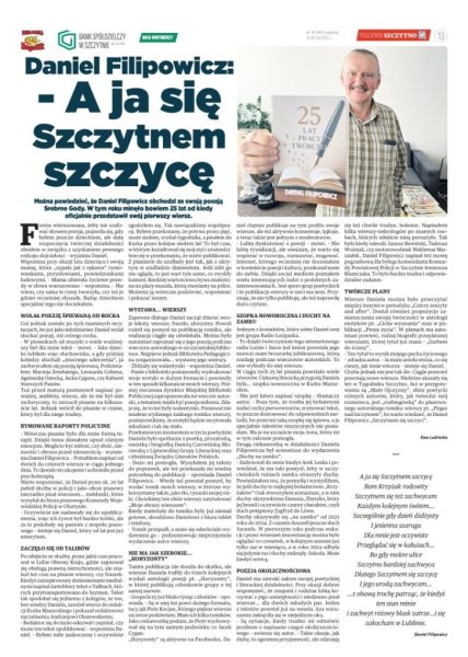 Chyba jednak nie jest tak źle. Ciągle przecież powstają nowe wiersze. Niektóre ukazały się też w Tygodniku Szczytno. Już w przygotowaniu są „Małe Ojczyzny”, zbiór poetycki różnych autorów, który, jak twierdzi mój rozmówca, jest „rozbiegówką” do planowanego autorskiego tomiku wierszy pt. „Pegaz nad Szczytnem”, bo warto wiedzieć, że Daniel Filipowicz „Szczytnem się szczyci”.