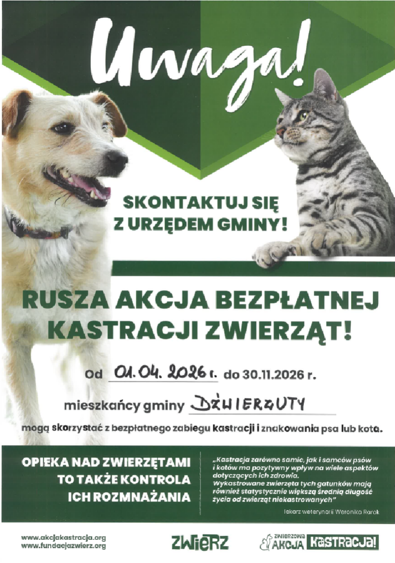 Samorząd tłumaczy wprost: chodzi o ograniczenie niekontrolowanego rozmnażania i zmniejszenie liczby bezdomnych zwierząt. Akcja rusza od początku kwietnia i potrwa kilka miesięcy. W praktyce – do momentu, aż skończą się pieniądze.