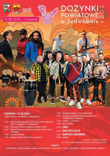 Na uczestników czekają tradycyjne elementy uroczystości, takie jak ceremoniał dożynkowy, występy zespołów ludowych oraz stoiska z regionalnymi wyrobami. Wydarzenie uświetnią występy znakomitych artystów. Gwiazdami wieczoru będą: zespół ENEJ oraz legendarna grupa lat 80. - BAD BOYS BLUE. Obok nich zaprezentują się nasze lokalne talenty: Zespół Pieśni i Tańca „Jedwabno”, Bartosz Abramski oraz Black Minds z Szuci.