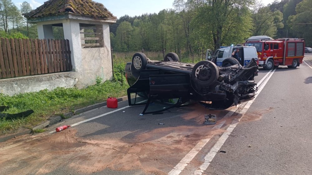 - Jechaliśmy od strony Jedwabna, ten pan, z pasażerem jechali od strony Janowa i na zakręcie zniosło ich, odbili się od ogrodzenia i dopiero przed naszym autokarem ich samochód wyhamował na dachu - mówi Rafał Bałdyga, prezes Gwardii Szczytno.