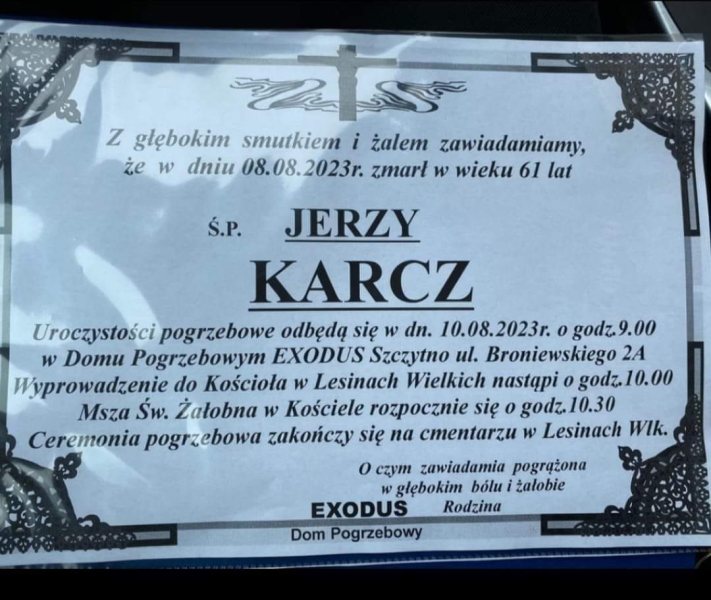 Uroczystości pogrzebowe rozpoczną się o godz. 9 w czwartek, 10 sierpnia w Domu Pogrzebowym Exodus w Szczytnie (ul. Broniewskiego 2A).