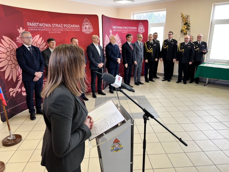 Po złożeniu meldunku przez dowódcę uroczystości kpt. Macieja Woźniaka Panu Ministrowi Błażejowi Pobożemu, nastąpiło odśpiewanie hymnu Rzeczpospolitej Polskiej po czym w imieniu gospodarza uroczystości Pana Wójta Sławomira Wojciechowskiego, zgromadzonych gości przywitała Zastępca Wójta Gminy Szczytno Pani Ewa Zawrotna. Kolejnym oraz najważniejszym punktem spotkania było wręczenie promes dla poszczególnych jednostek Ochotniczych Straży Pożarnych, którego dokonał Pan Minister Błażej Poboży, Pan Poseł Jerzy Małecki, Wojewoda Pan Artur Chojecki, Pan Prezes Jarosław Bogusz, Pan Dyrektor Henryk Żuchowski oraz Pan Komendant nadbryg. Tomasz Komoszyński.