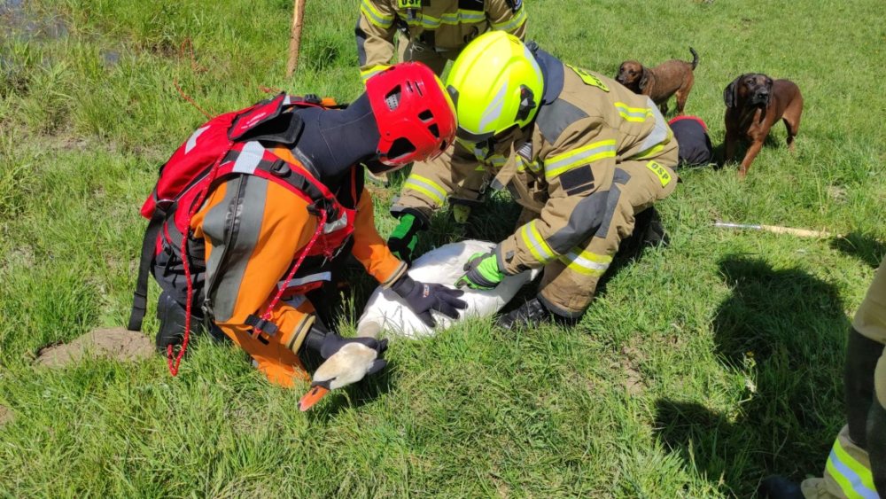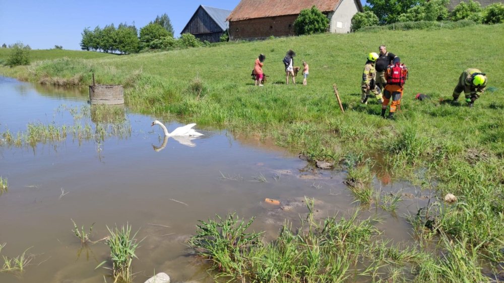 Około godziny 11:00, na miejscowym stawie zauważono łabędzia, który zaplątał się w drut od pastucha elektrycznego. Wezwani strażacy ruszyli z akcją ratunkową. Dzięki sprawnym działaniom, udało się bezpiecznie wyciągnąć ptaka z wody i przetransportować go na brzeg.