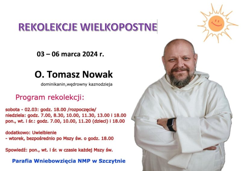 Zbliżająca się wiosna to czas odrodzenia nie tylko w przyrodzie, ale i w duchowości. Parafia Wniebowzięcia NMP w Szczytnie zaprasza na rekolekcje wielkopostne, które poprowadzi charyzmatyczny dominikanin, O. Tomasz Nowak, znany z wędrownych misji i przemyślanych kaznodziejstw. Rozpocznij marzec z odnową ducha i umocnij swoją wiarę!