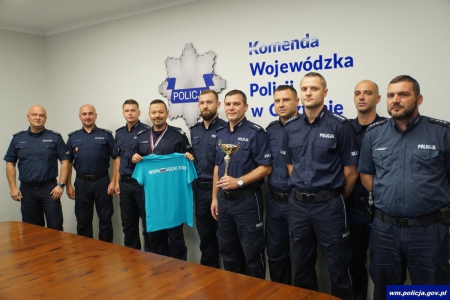 Z kolei dzisiaj (18.09.2019 r.) w Komendzie Wojewódzkiej Policji w Olsztynie nadinspektor Tomasz Klimek przyjął policjantów z IPA Region Olsztyn, którzy w dniach od 23 do 31 sierpnia 2019 roku reprezentowali nasz kraj w turnieju piłki nożnej służb bezpieczeństwa, zorganizowanym w okolicy Soczi w Rosji zdobywając II miejsce. Wyrazy uznania policjantom z garnizonu warmińsko - mazurskiego osobiście przekazał nadinsp. Tomasz Klimek. Policjanci w podziękowaniu za wsparcie ich wyjazdu, przekazali generałowi pamiątkową koszulkę, puchar oraz medal z turnieju. Szef warmińsko - mazurskich policjantów pogratulował funkcjonariuszom tego sukcesu i podtrzymał swoje zaangażowanie w kwestii wspierania drużyny podczas ich wyjazdów za granicę.