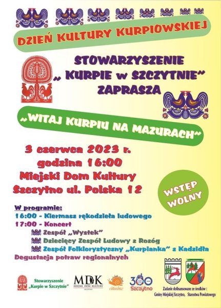 Dzień Kultury Kurpiowskiej w Szczytnie, czyli „Witaj Kurpiu na Mazurach”, to wyjątkowe święto, które ożywia starych tradycji i kulturowe dziedzictwo regionu. Już po raz kolejny Stowarzyszenie „Kurpie w Szczytnie” zaprasza wszystkich na niezapomnianą podróż do serca Kurpiowszczyzny. Wydarzenie zaplanowano na sobotę, 3 czerwca. Wstęp wolny.