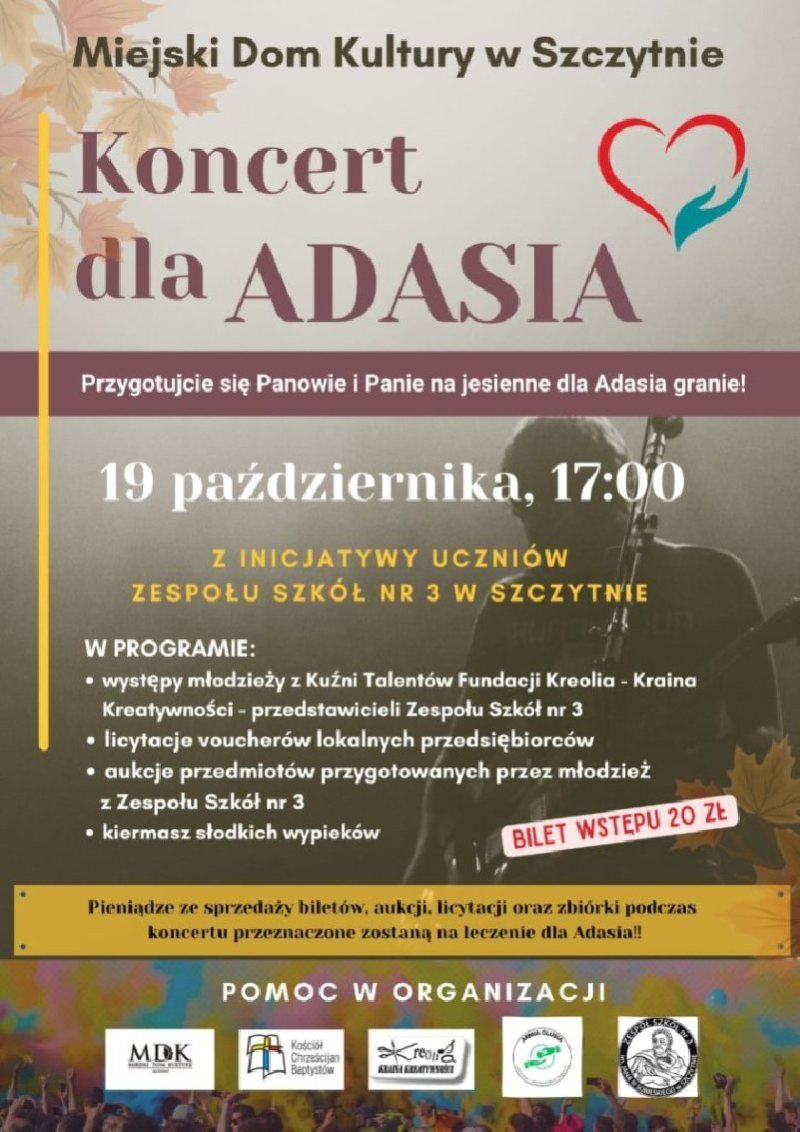 Dla Adasia zagrają i zaśpiewają między innymi jego koledzy i koleżanki ze szkoły oraz młodzież z Kuźni Talentów Fundacji Kreolia. Będą liczne aukcje, licytacja i kiermasz. Całkowity dochód z tego wydarzenia przeznaczany zostanie na leczenie nastolatka.