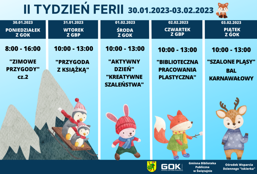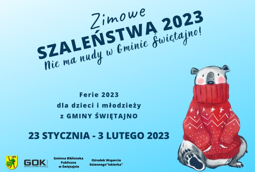 Od 23 stycznia do 3 lutego będzie można skorzystać z różnorodnych zajęć (szczegóły na plakatach). Nie zwlekaj z zapisami, bo te rozpoczną się już od wtorku, 17 stycznia. Szczegóły na plakatach rozwieszonych na terenie gminy oraz stronie internetowej miejscowego Gminnego Ośrodka Kultury oraz profilach facebookowych. Do zobaczenia na feriach zimowych w Gminie Świętajno!"