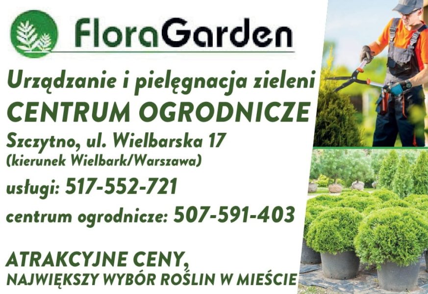 Centrum Ogrodnicze Flora Garden zaprasza. Szczytno, ul. Wielbarska 17 (kierunek Wielbark/Warszawa). Usługi: 517-552-721. Centrum ogrodnicze: 507-591-403. Atrakcyjne ceny, największy wybór roślin w mieście. Zapraszamy po nowości...